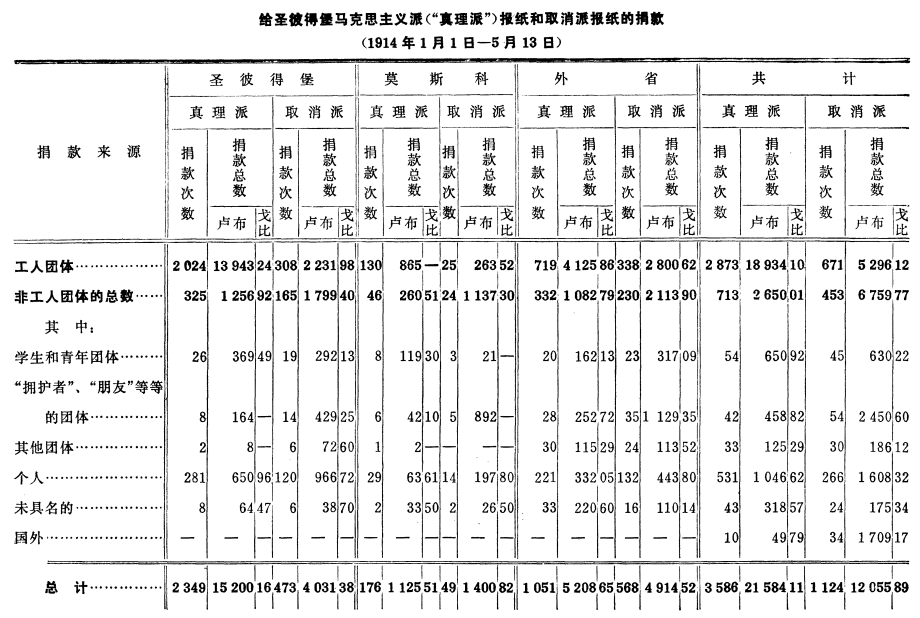 说明1914年1月1日―5月13日给圣彼得堡“真理派”(马克思主义派)的报纸和取消派的报纸的捐款情形的完整材料,已经由维·亚·吉·同志整理出来了。现在我们把他编制的表格全部刊印出来,而在正文里,为了不让数字过分地麻烦读者,我们有时只引用整数。