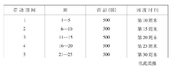 为了便于计算,我们假定:劳动期间为5周,流通期间为5周,因而周转期间为10周;一年按50周计算,每周的资本支出是100镑。这样,劳动期间需要有流动资本500镑,流通时间也需要追加资本500镑。劳动期间和周转时间如下: