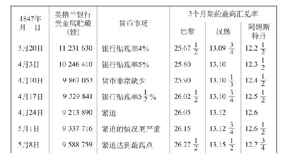 《经济学家》提到利息率的提高和货币市场所受的其他压力对1847年汇兑率的迅速影响。但是不要忘记,尽管汇兑率发生了逆转,一直到4月底,金还是继续外流;只是到5月初,才发生逆转。