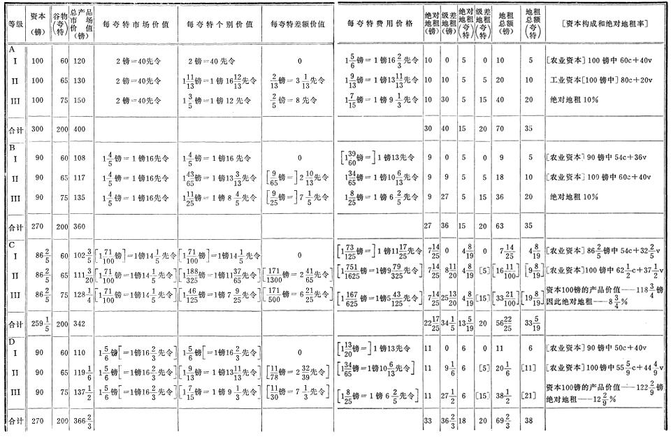 | 等级 | 资本 (镑) | 谷物 (夸特) | 总产品市场价值 (镑) | 每夸特市场价值 (镑) | 每夸特个别价值 | 每夸特差额价值 |