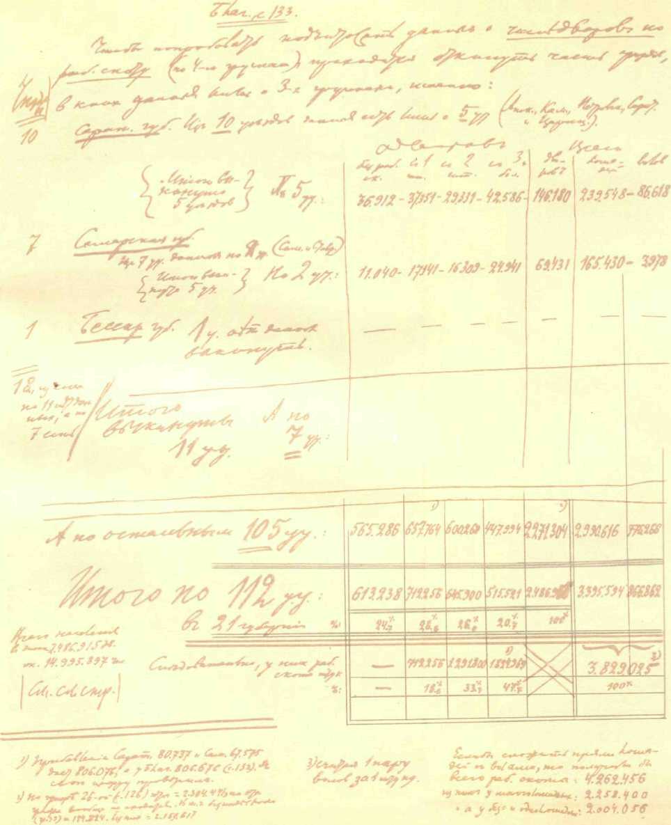 Страница тетради В. И. Ленина с выписками и расчетами из книги Н. А. Благовещенского «Сводный статистический сборник» (1893 г.) 134-135